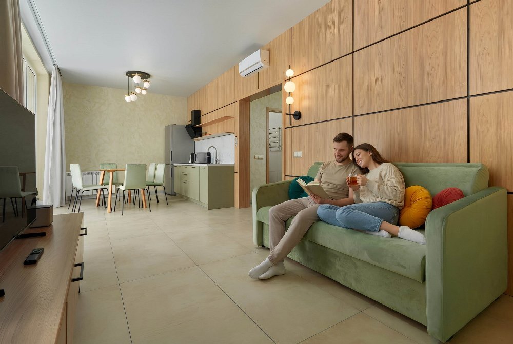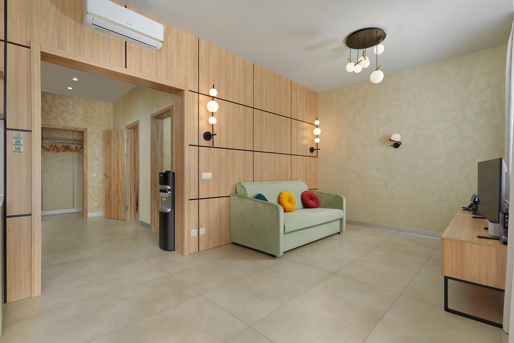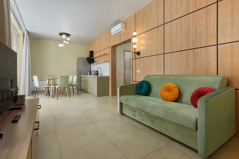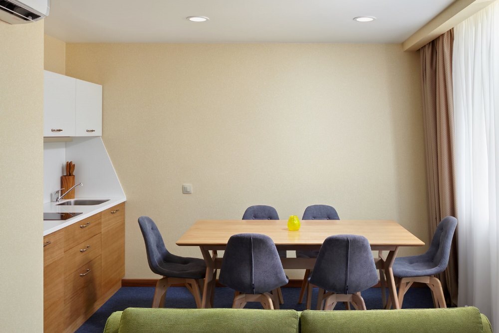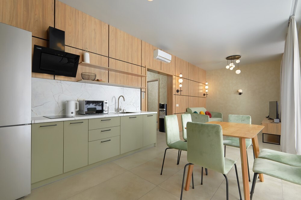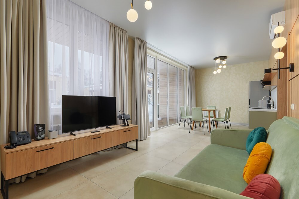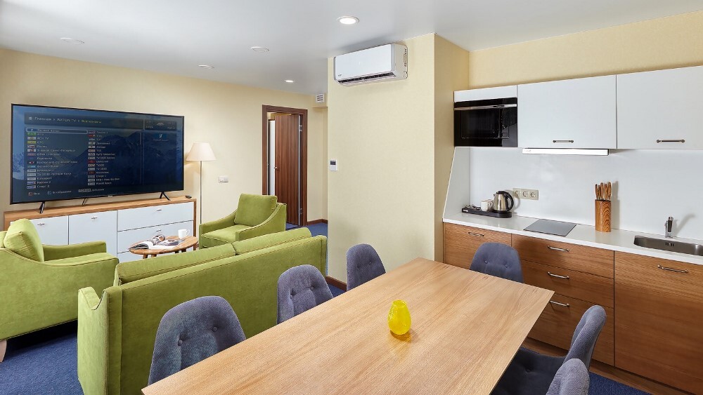 В номере: Бесплатный Wi-Fi, Ванная комната, Диван-кровать, Душ, Журнальный столик, Зеркало, Кондиционер/Сплит-система, Кровати односпальные, Кровать двуспальная, Кухня, Набор одноразовой косметики, Обеденный стол, Посуда, Прикроватная тумбочка, СВЧ-печь, Стиральная машина, Стол, Столовая зона, Стул/Стулья, Тапочки, Телевизор, Телефон, Туалетные принадлежности, Фен, Халат, Холодильник, Чайник, Шкаф