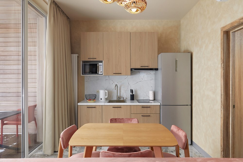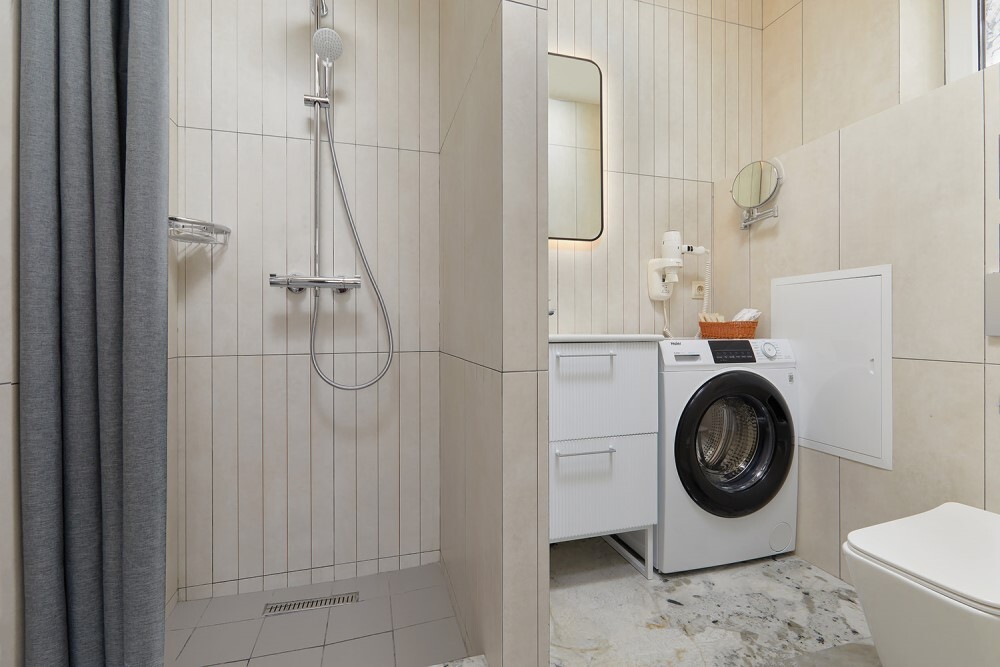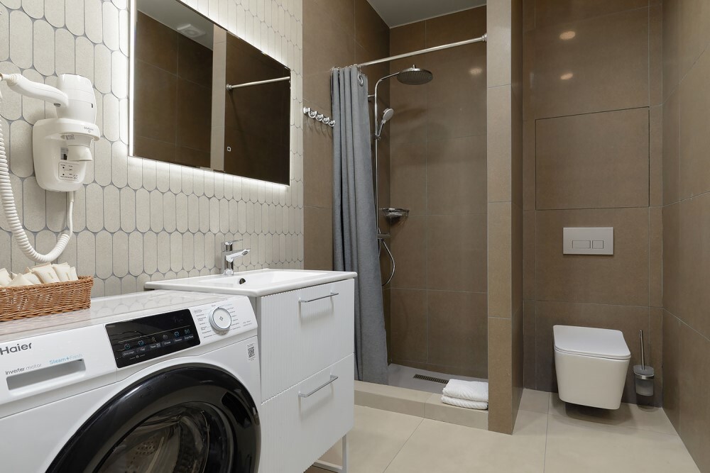 В номере: Чайник, Шкаф, Душ, Туалетные принадлежности, Фен, Халат, Холодильник, Телевизор, Телефон, Прикроватная тумбочка, СВЧ-печь, Стиральная машина, Тапочки, Стул/Стулья, Кровать двуспальная, Кухня, Набор одноразовой косметики, Обеденный стол, Посуда, Столовая зона, Кондиционер/Сплит-система, Зеркало, Журнальный столик, Ванная комната, Диван-кровать, Бесплатный Wi-Fi, Стол