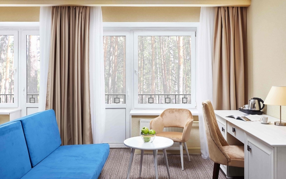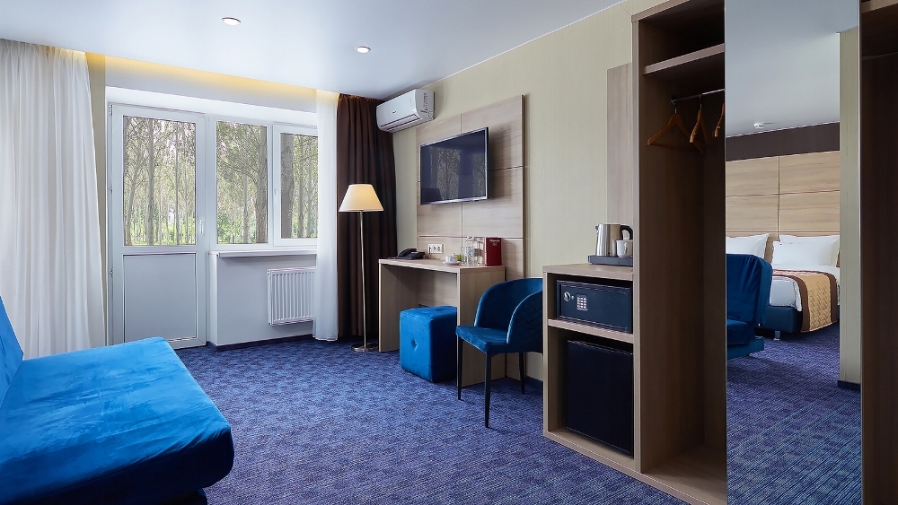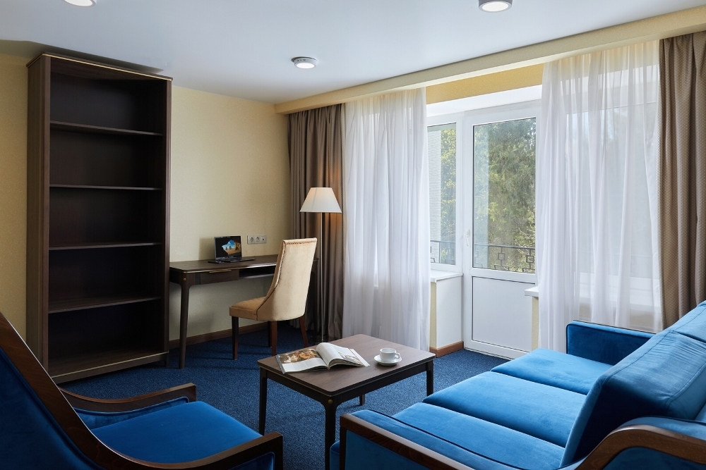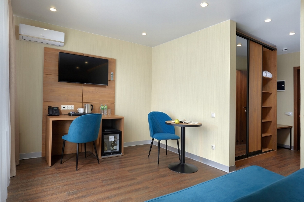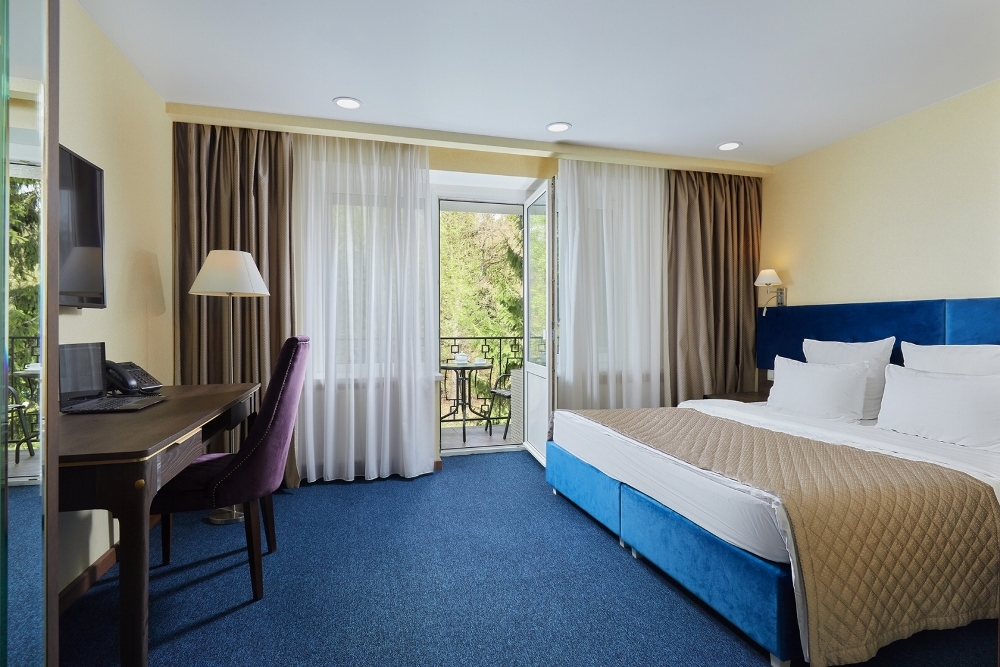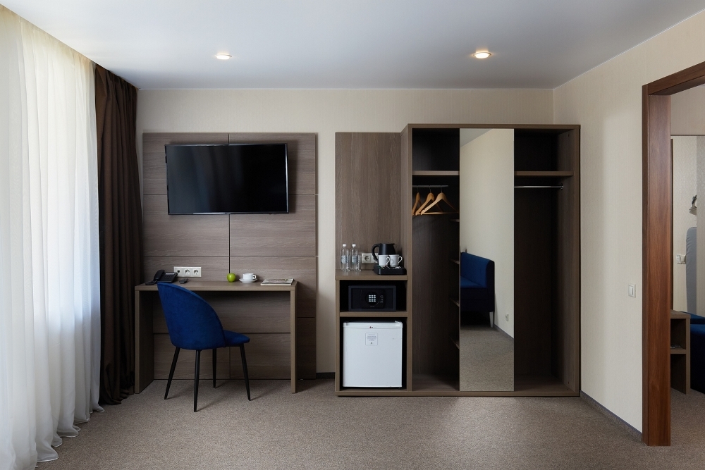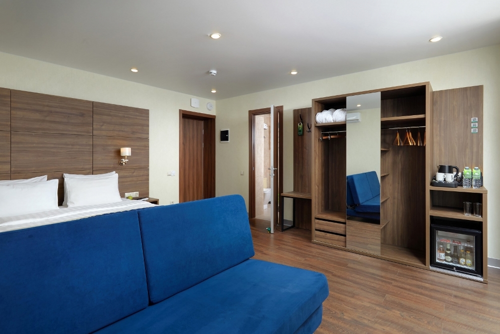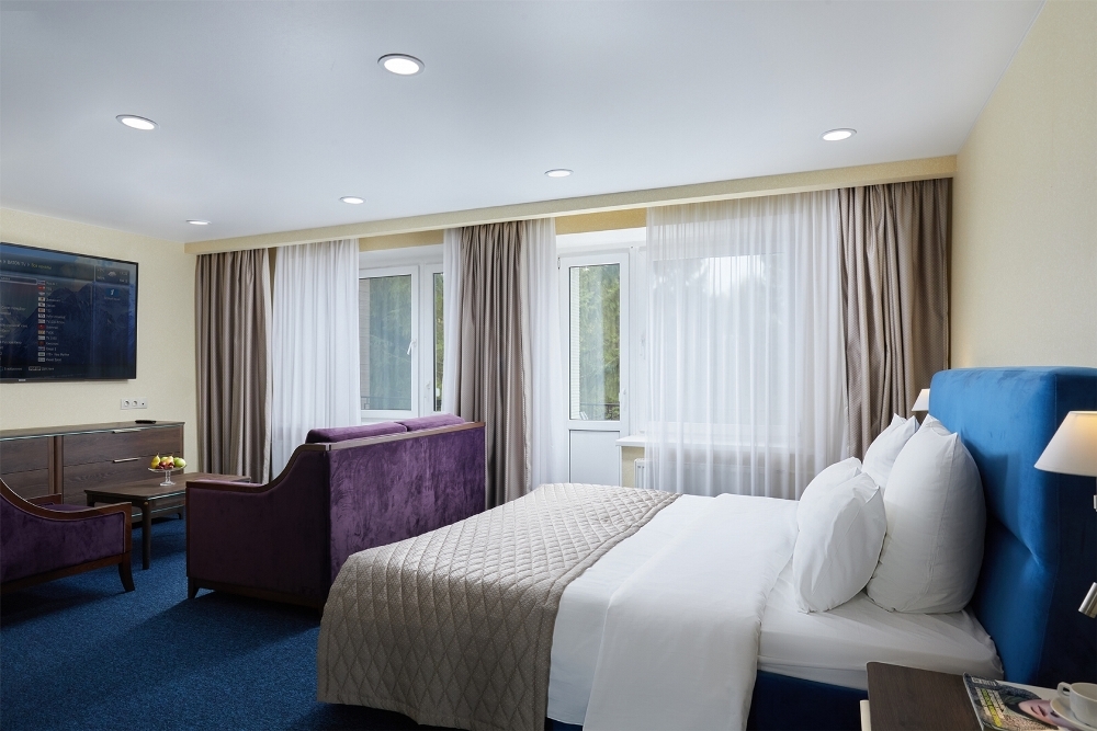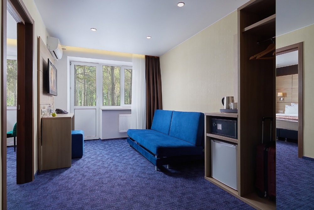 В номере: чайная станция, фен, утюг, сейф, минибар, халаты. В ванной комнате туалетные принадлежности, полотенца, фен. Халаты и тапочки в номерах предоставляются для гостей от 12 лет. Возможно размещение двух человек на основных местах, двух человек на диване, возможна установка еврораскладушки. Номера расположены в 5 корпусе на 1-2 этажах, все номера с балконом, оснащены кондиционером.