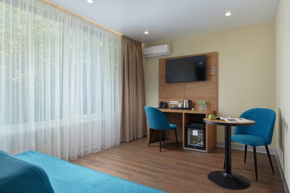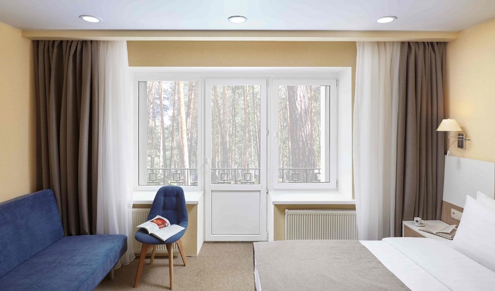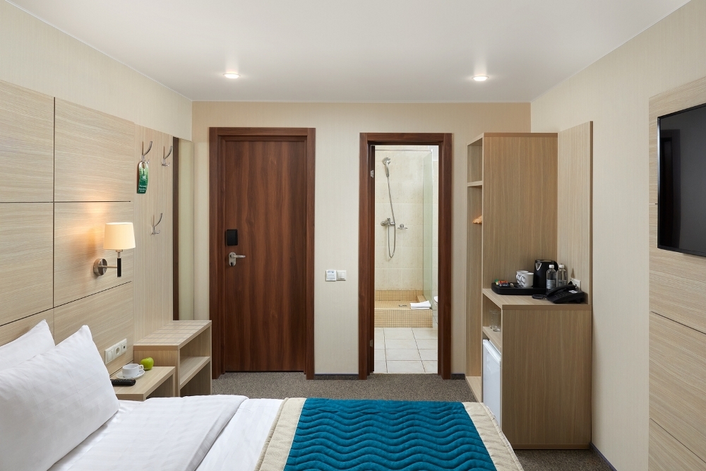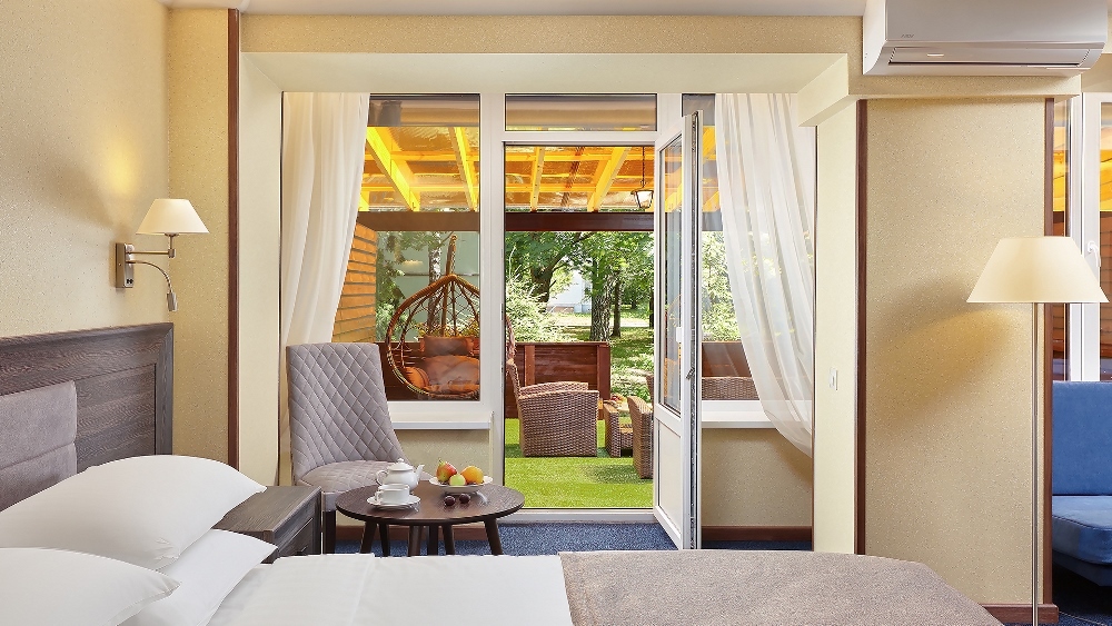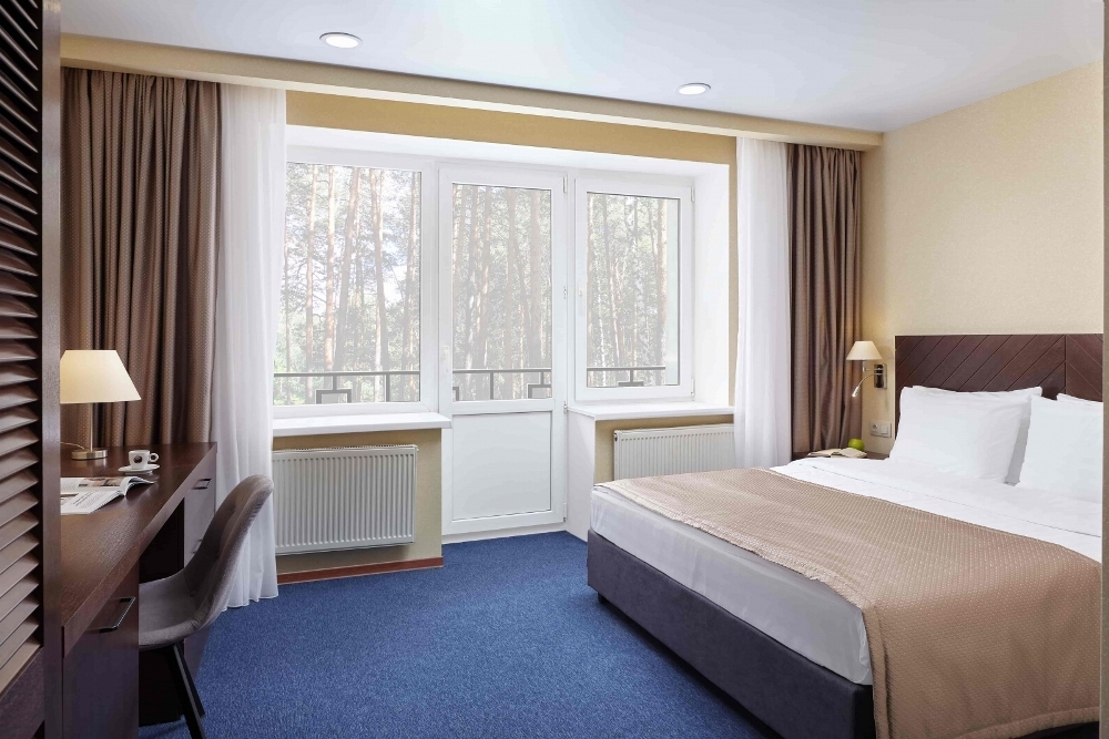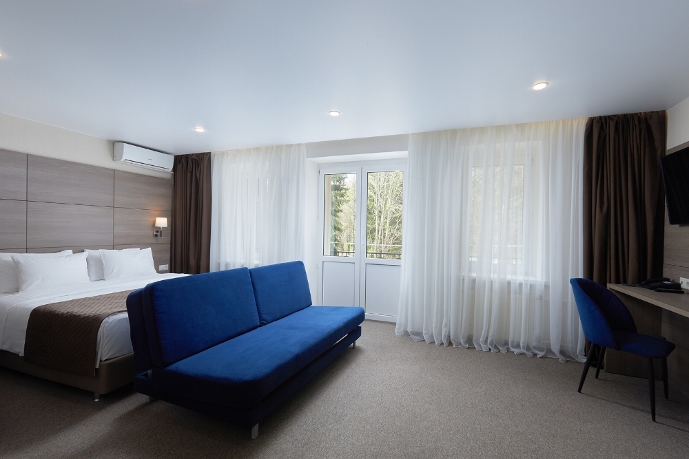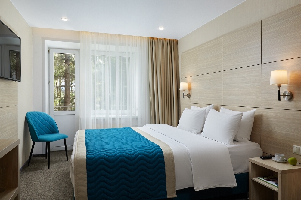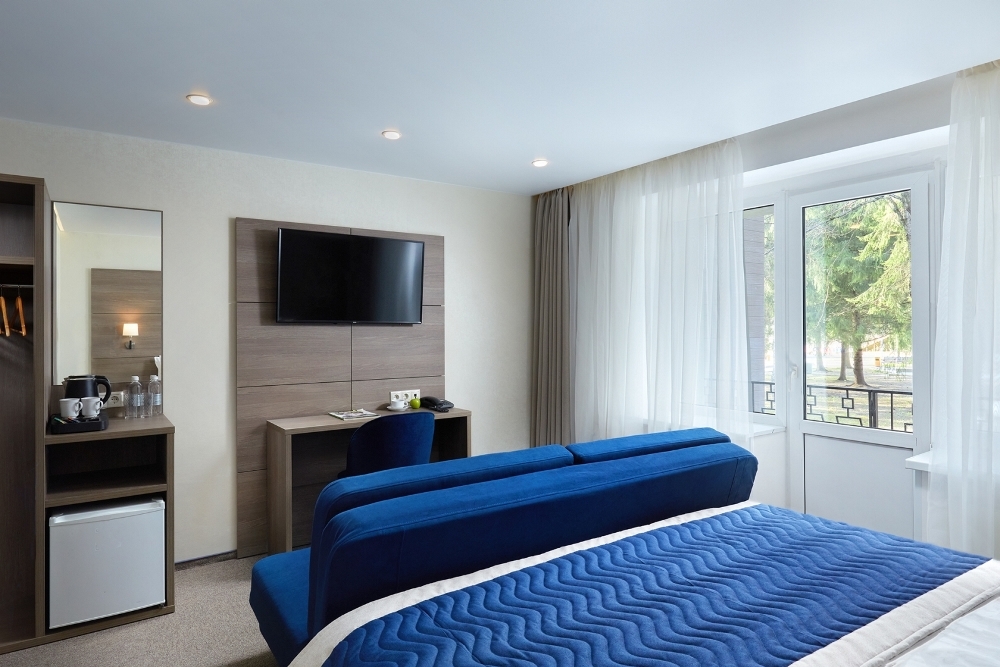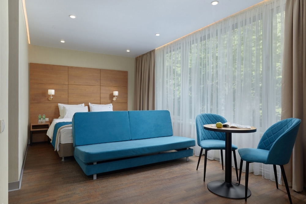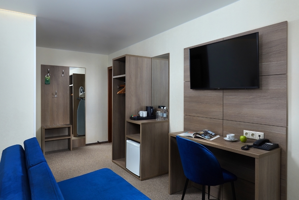 В номере: чайная станция, фен, утюг, сейф, минибар, халаты. В ванной комнате туалетные принадлежности, полотенца, фен. Халаты и тапочки в номерах предоставляются для гостей от 12 лет. Возможно размещение двух человек на основных местах, двух человек на диване, возможна установка еврораскладушки. Номера расположены в 5 корпусе на 1-2 этажах, все номера с балконом, оснащены кондиционером.