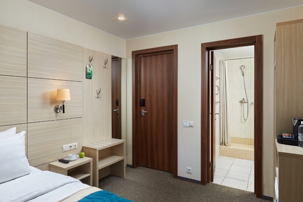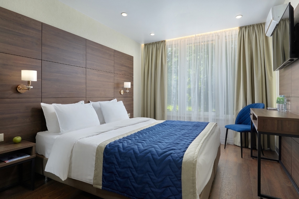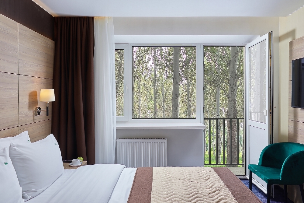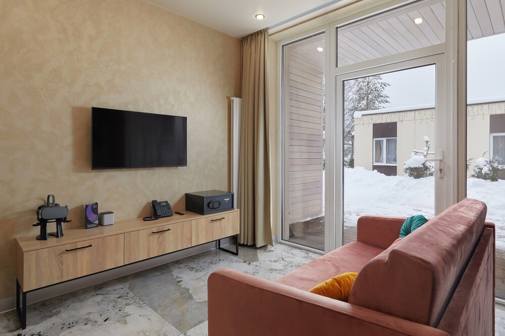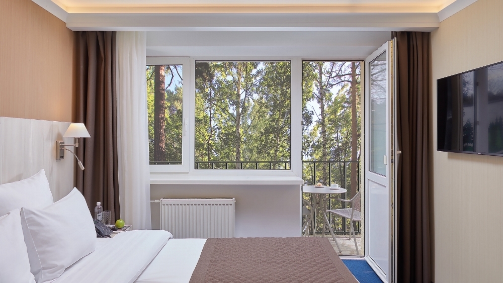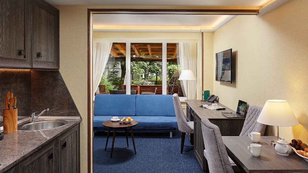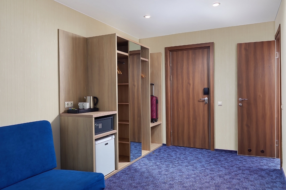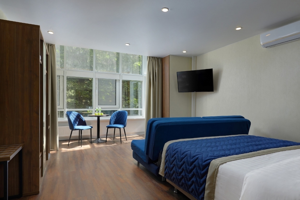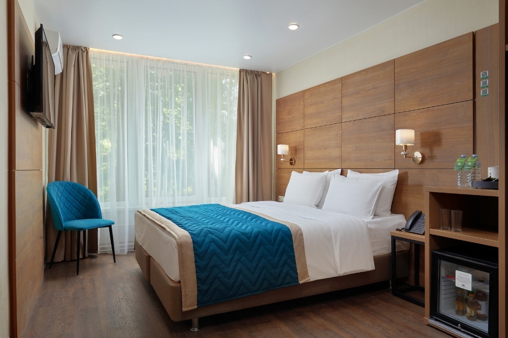 В номере: чайная станция, фен, утюг, сейф, минибар, халаты. В ванной комнате туалетные принадлежности, полотенца, фен. Халаты и тапочки в номерах предоставляются для гостей от 12 лет. Возможно размещение двух человек на основных местах, двух человек на диване, возможна установка еврораскладушки. Номера расположены в 5 корпусе на 1-2 этажах, все номера с балконом, оснащены кондиционером.