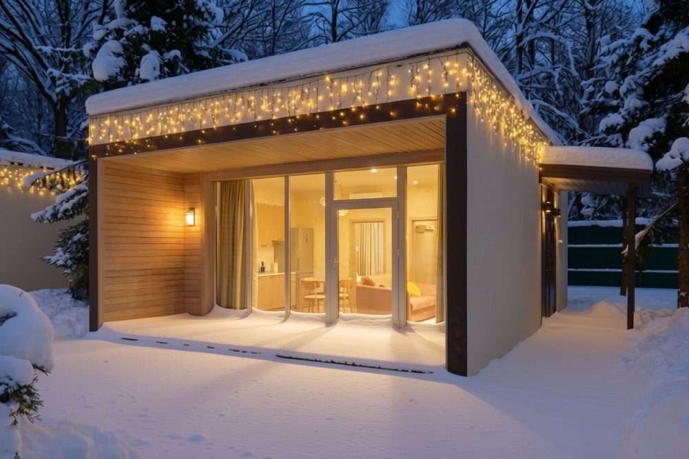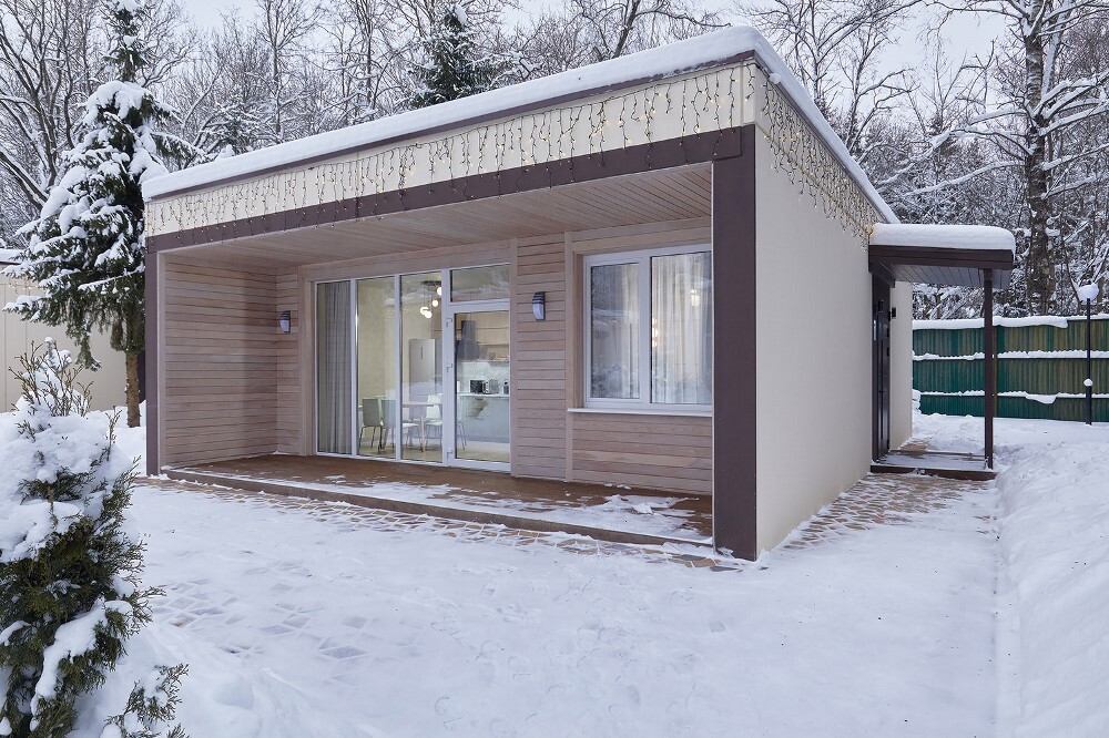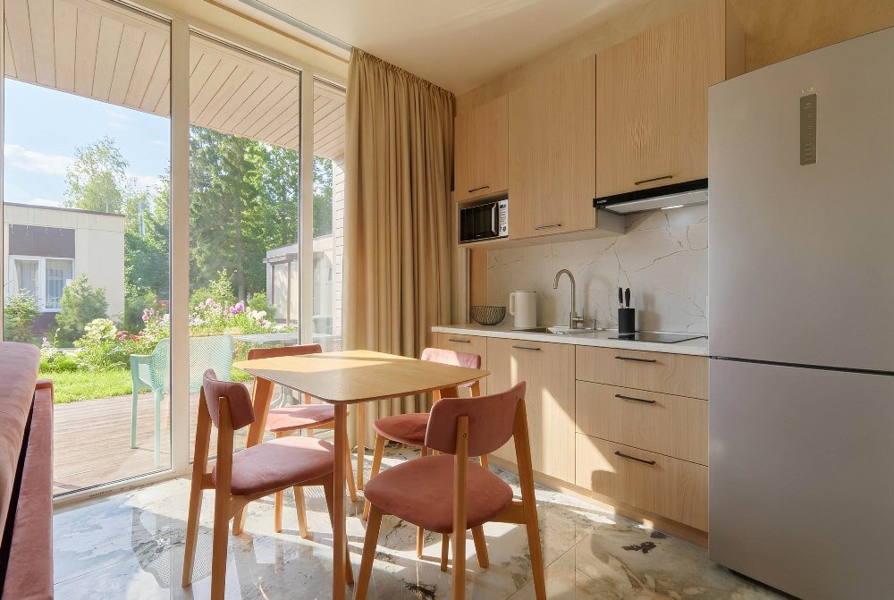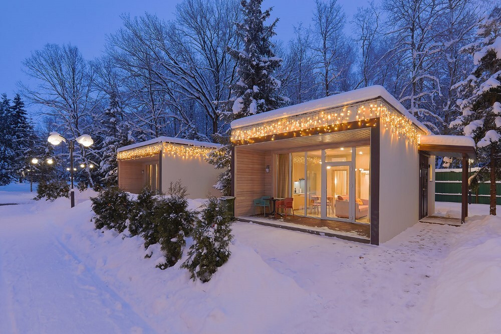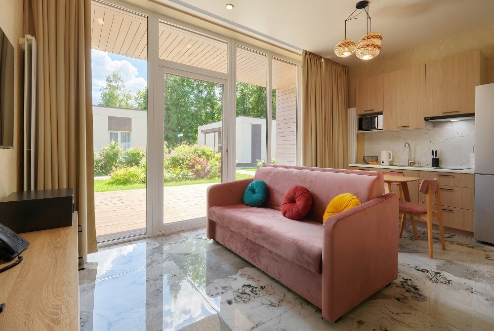 В коттедже расположена гостиная-кухня, спальная комната, веранда. Напольное покрытие: керамогранит, с функцией тёплого пола. Площадь коттеджа: 40 м². Вместимость: до 4 человек