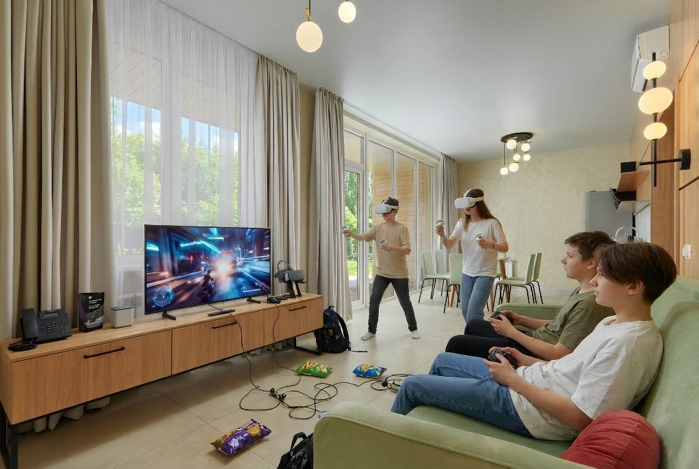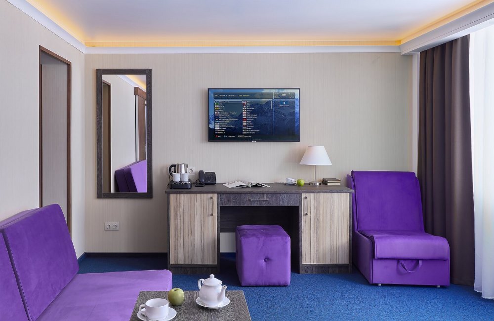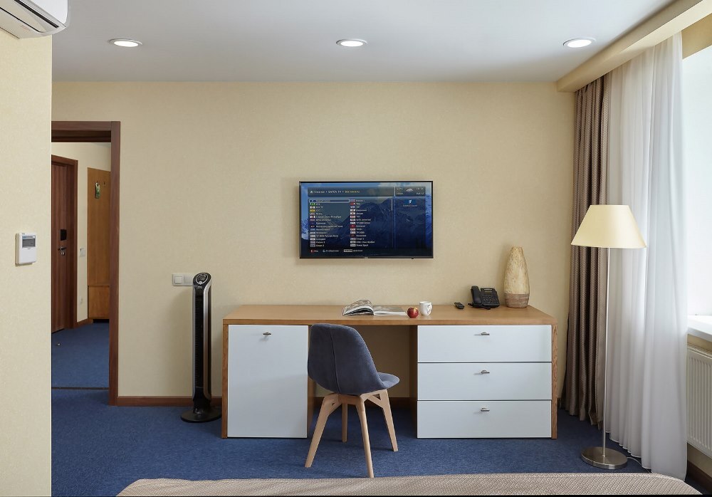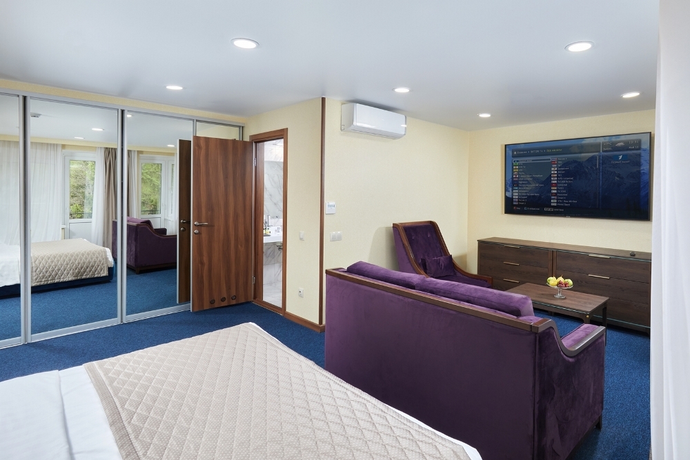 В номере: чайная станция, фен, утюг, стиральная машина, сейф, два телевизора, минибар. В ванной комнате туалетные принадлежности, полотенца, тапочки, халаты на каждого гостя. Возможно размещение двух человек на основных местах, двух человек на диване, возможна установка еврораскладушки. Номера расположены в 5 корпусе на 3 этаже, все номера с балконом, оснащены кондиционером.