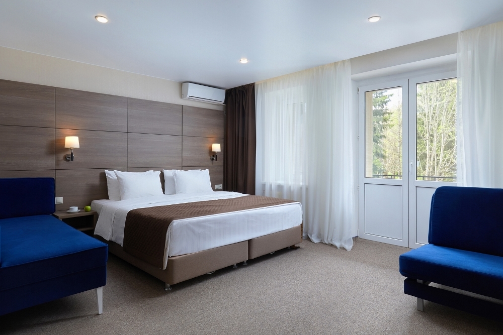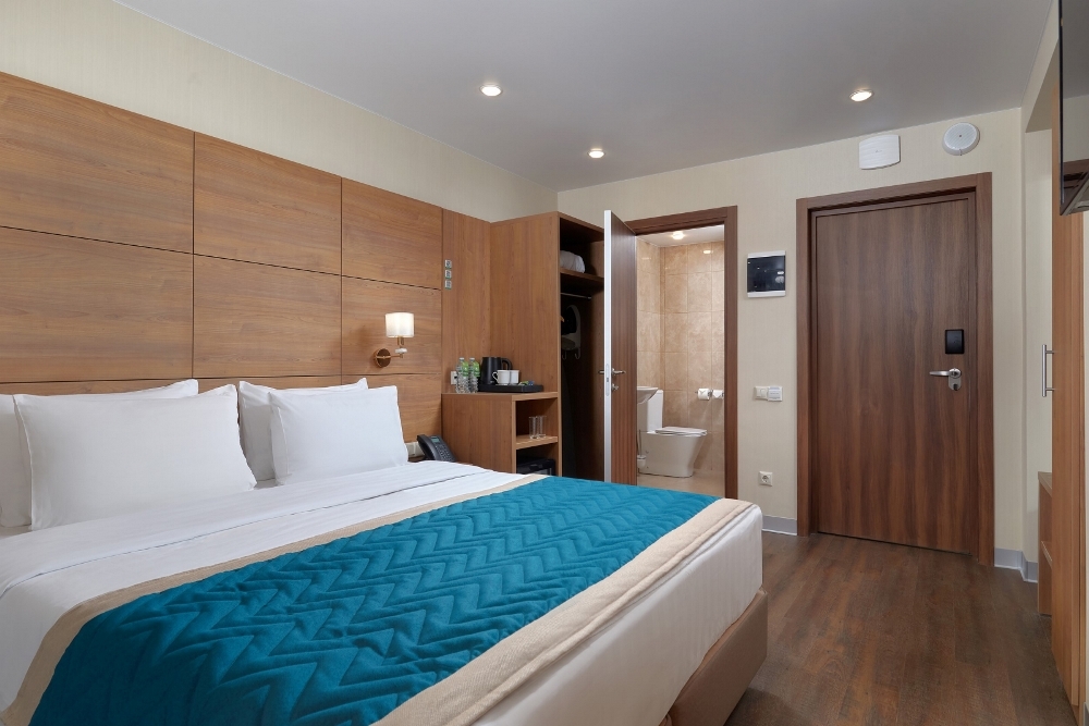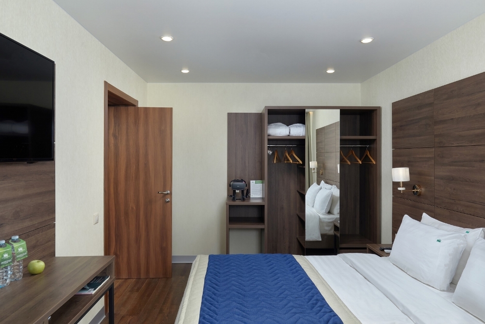 В номере: двуспальная кровать, прикроватные тумбочки, шкаф для одежды, стол, небольшой диван, журнальный столик, стул, туалетный столик, вешалка для верхней одежды, телевизор, чайная станция, внутренний телефон, кондиционер, открытый балкон. В ванной комнате туалетные принадлежности, полотенца, фен. Халаты и тапочки в номерах предоставляются для гостей от 12 лет. Возможно дополнительное место - детский манеж.