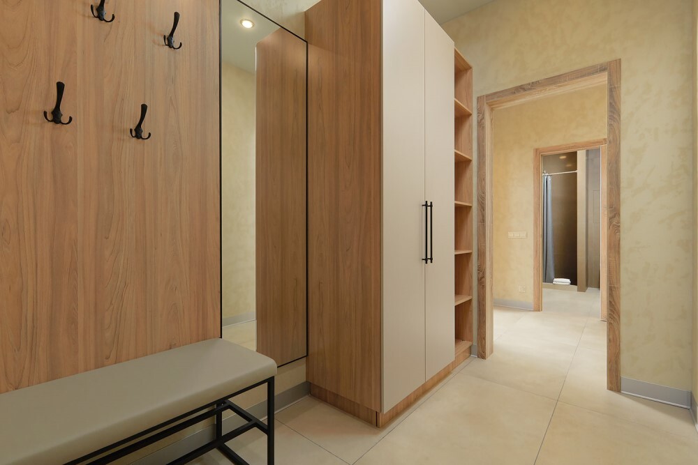 Однокомнатный номер с небольшой прихожей, где расположены вешалка и шкаф для одежды.
