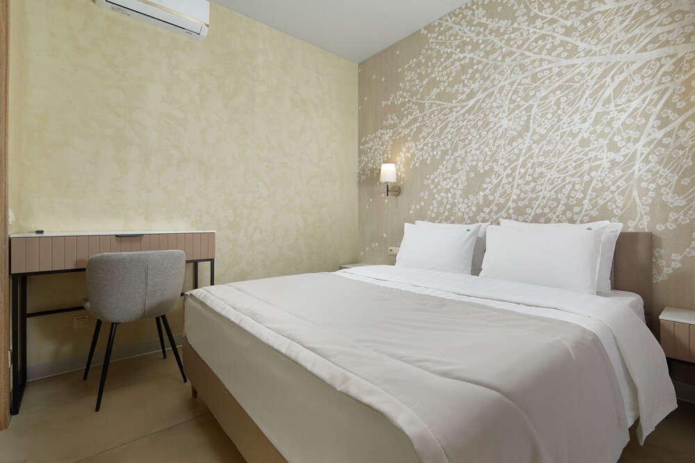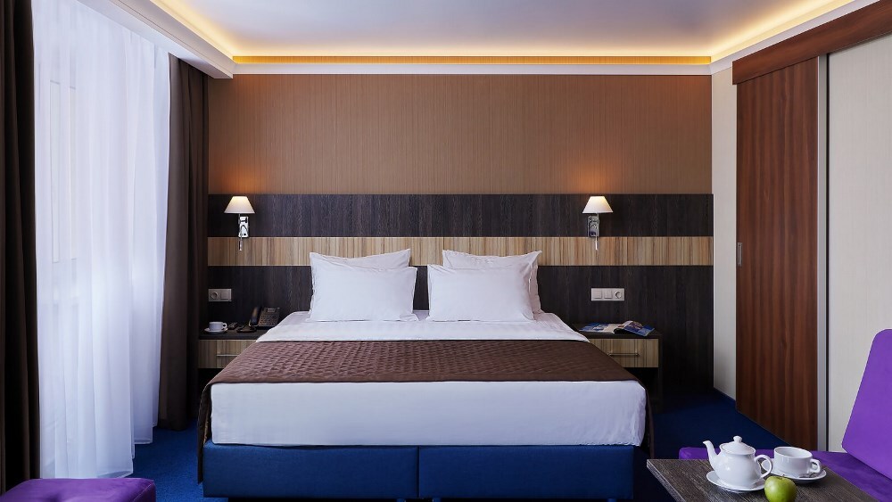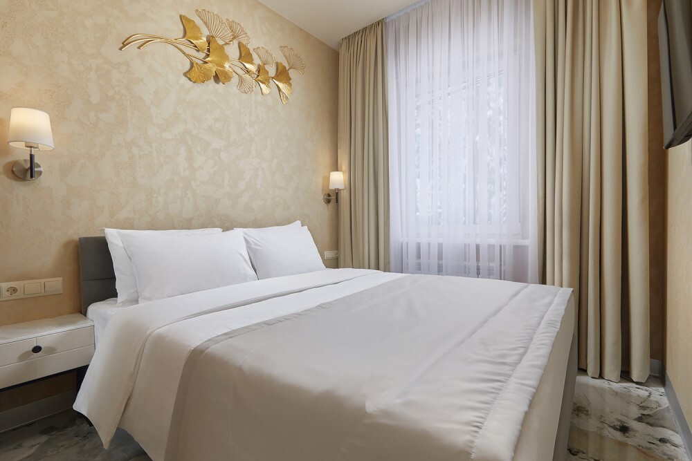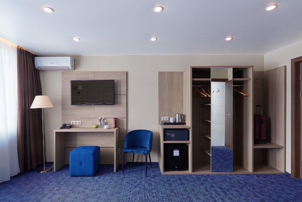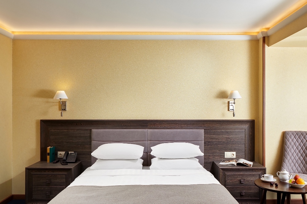 В номере: двуспальная кровать, прикроватные тумбочки, шкаф для одежды, стол, небольшой диван, журнальный столик, стул, туалетный столик, вешалка для верхней одежды, телевизор, чайная станция, внутренний телефон, кондиционер, без балкона. В ванной комнате туалетные принадлежности, полотенца, фен. Халаты и тапочки в номерах предоставляются для гостей от 12 лет.