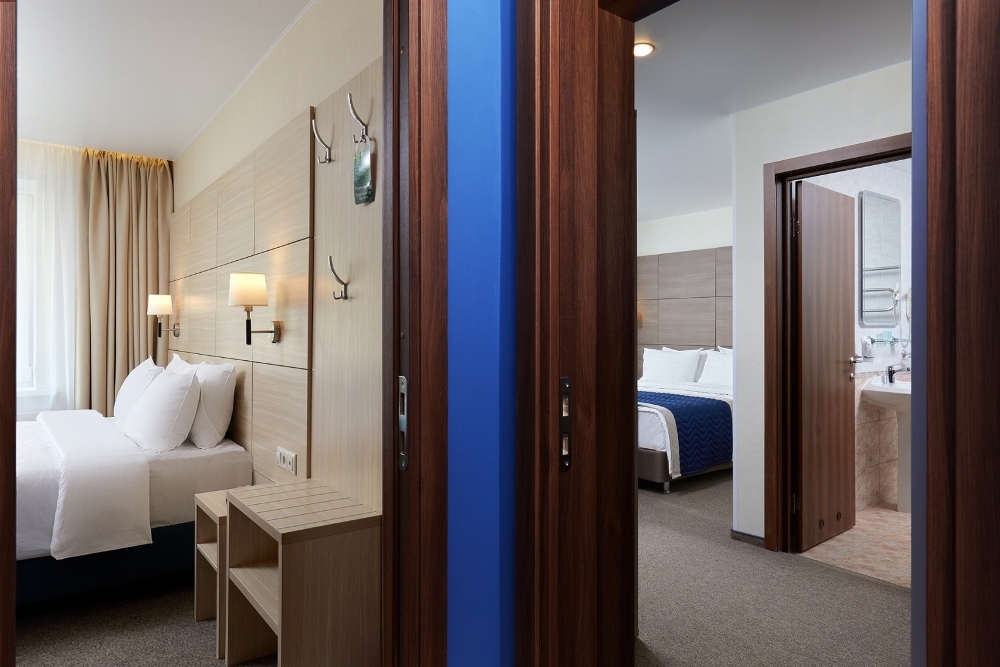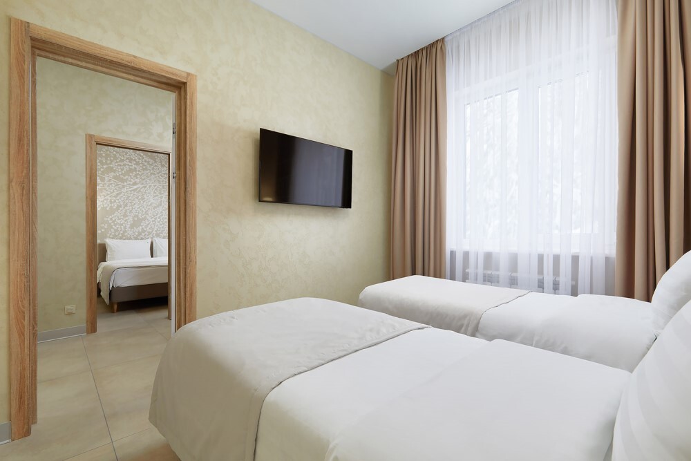 Это два смежных номера категории "Стандарт" (12 кв.м., кровать-трансформер) и "Улучшенный стандарт" (19,5 кв.м., двуспальная кровать и раскладывающийся 1,5-спальный диван), в каждом из которых есть своя ванная комната и спальная зона. Номера расположены на 1этаже.
