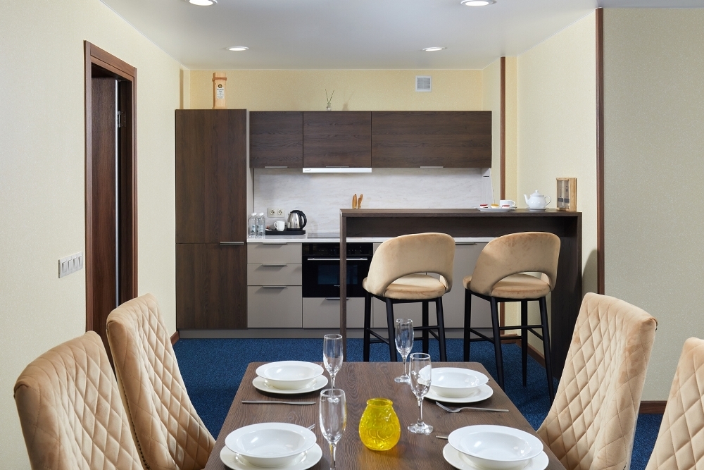 Номер площадью 60 кв.м. В номере двуспальная кровать, раскладывающийся 1,5-спальный диван, мини-кухня, обеденная зона, два санузла.