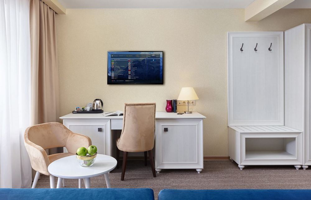 Номер площадью 22 кв.м., двуспальная кровать, раскладывающийся 1,5-спальный диван. В номере телевизор, чайная станция, минибар. В ванной комнате туалетные принадлежности, полотенца, фен. Халаты и тапочки в номерах предоставляются для гостей от 12 лет.