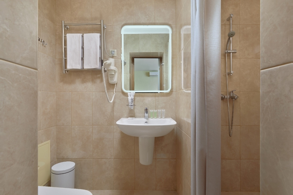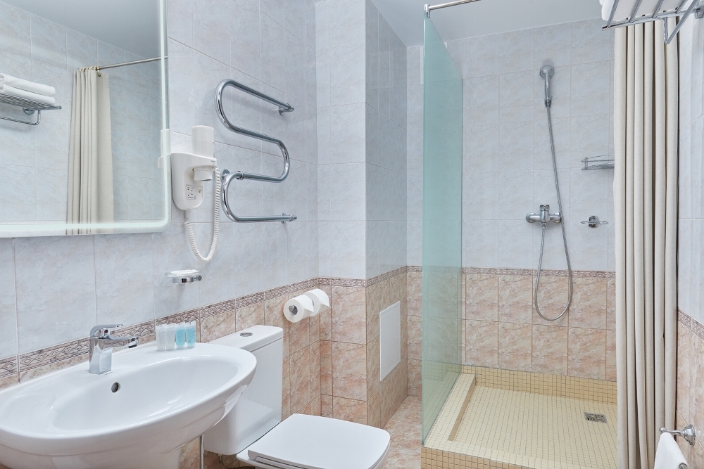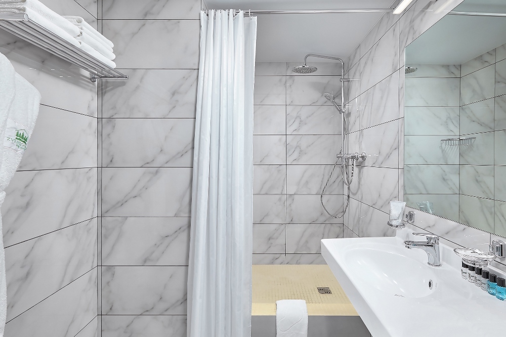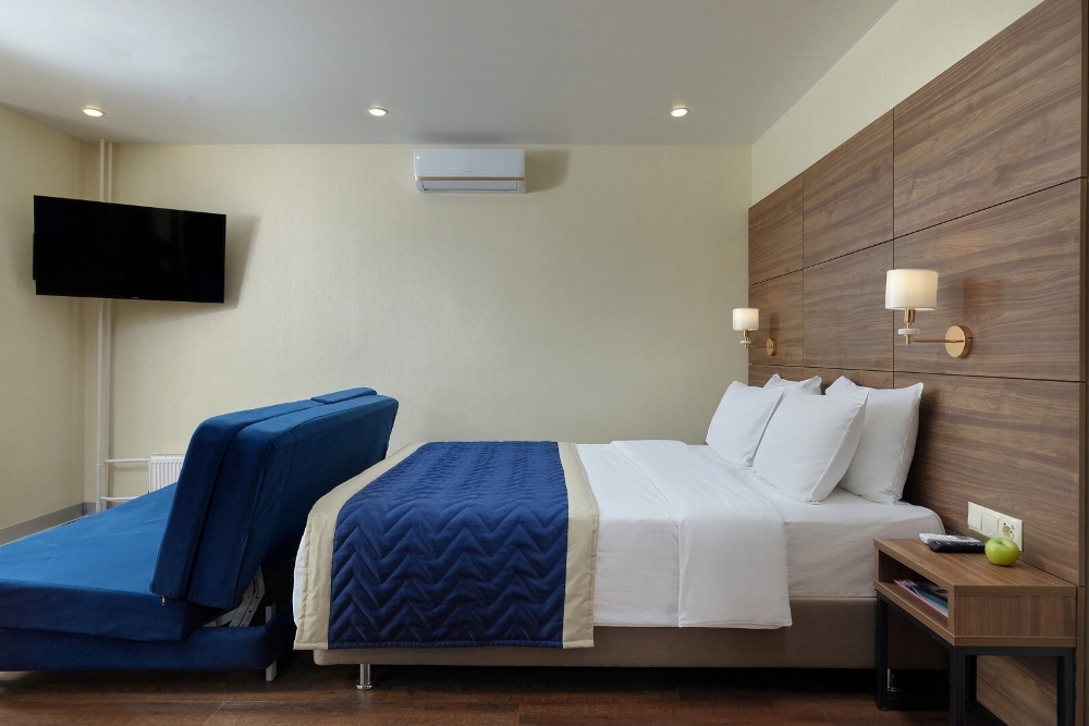 Комфортное проживание 2-3 человека. Кровать-трансформер (двуспальная кровать или две раздельные кровати), раскладной небольшой диван, стол, стул, туалетный столик, телевизор, внутренний телефон, кондиционер, без балкона. В ванной комнате туалетные принадлежности, полотенца, фен. Халаты и тапочки в номерах предоставляются для гостей от 12 лет.