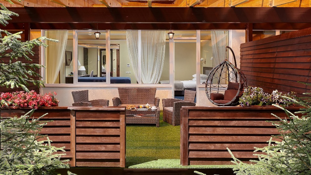 Номер площадью 38 кв.м., крытая веранда – 30 кв.м. Двуспальная кровать, раскладывающийся 1,5-спальный диван, мини-кухня. В номере: чайная станция, фен, утюг, сейф, минибар, халаты. В ванной комнате туалетные принадлежности, полотенца, тапочки, халаты на каждого гостя. Возможно размещение двух человек на основных местах, двух человек на диване, возможна установка еврораскладушки. Номера расположены в 2 корпусе на первом этаже, все номера с балконом, оснащены кондиционером.