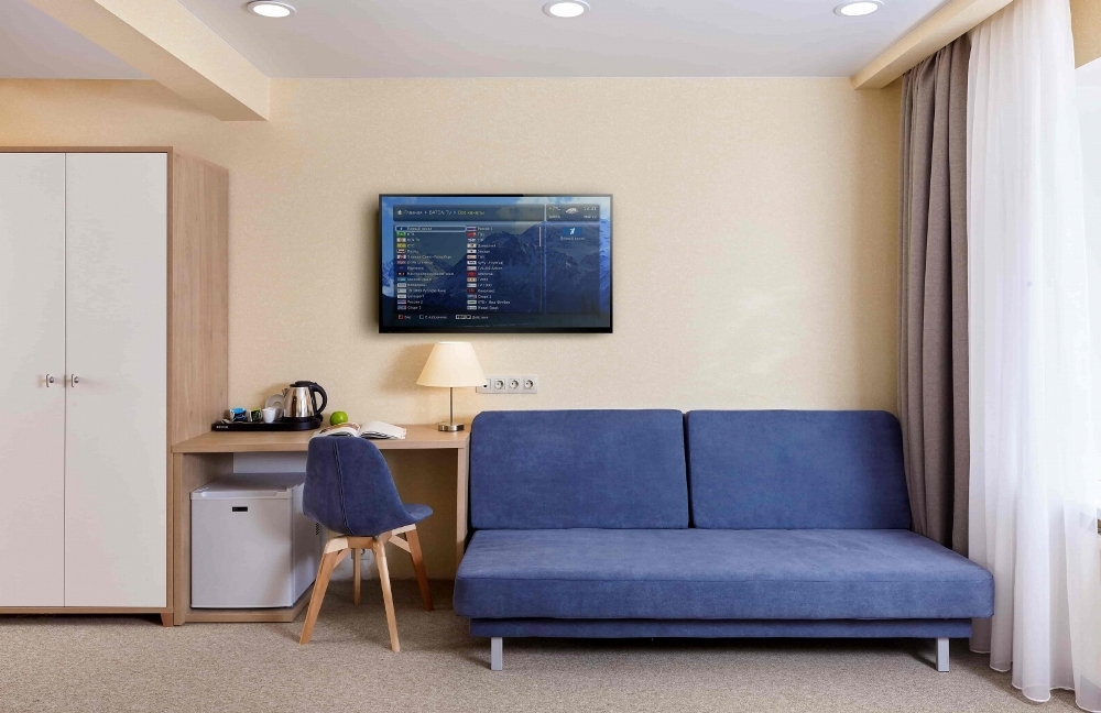 В номере: Бесплатный Wi-Fi, Ванная комната, Душ, Зеркало, Холодильник, Чайная станция, Набор одноразовой косметики, Посуда, Прикроватная тумбочка, Стол, Стул/Стулья, Телевизор, Телефон, Туалетные принадлежности, Фен, Шкаф, Кабельное телевидение, Халат, Диван-кровать, Журнальный столик, Кондиционер/Сплит-система, Кровать двуспальная, Тапочки