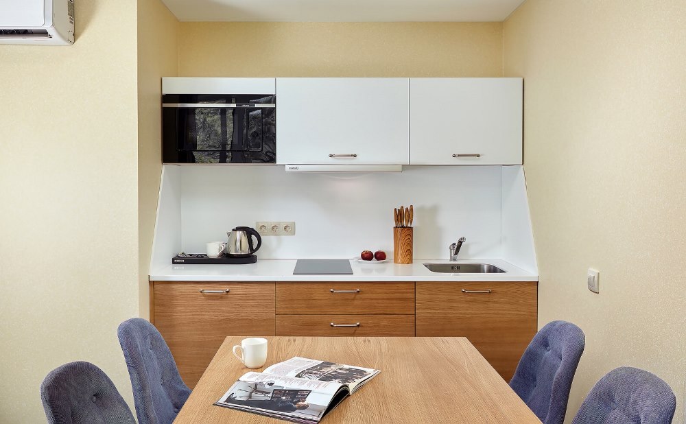 В номере: Холодильник, Мини-бар, Бесплатный Wi-Fi, Ванная комната, Душ, Зеркало, Фен, Шкаф, Набор одноразовой косметики, Посуда, Прикроватная тумбочка, Стол, Стул/Стулья, Телевизор, Телефон, Туалетные принадлежности, Кабельное телевидение, Балкон/терраса, Гладильные принадлежности, Диван-кровать, Журнальный столик, Кондиционер/Сплит-система, Кровать двуспальная, Кухня, Обеденный стол, Сейф, Тапочки, Халат, Чайная станция
