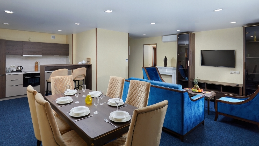 В номере небольшая прихожая с вешалкой, шкафом для одежды. Гостиная (около 30 кв.м) и спальная комната (14 кв.м). В номере двуспальная кровать, раскладывающийся диван, два телевизора, мини - кухня с микроволновой печью, холодильником, обеденная зона, утюг, гладильная доска, чайная станция, сейф, кондиционер, без балкон. В ванной комнате туалетные принадлежности, полотенца, тапочки, халаты на каждого гостя.