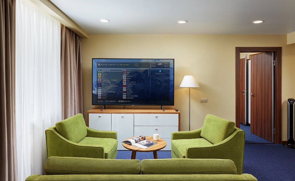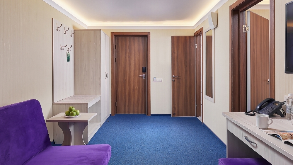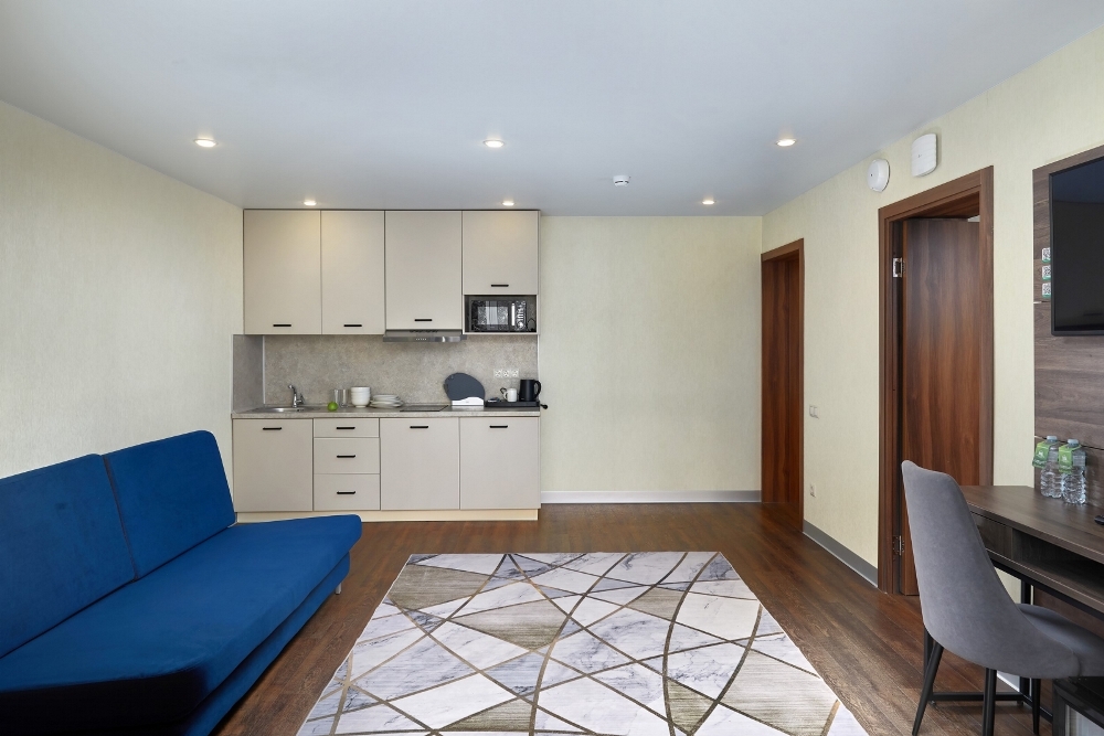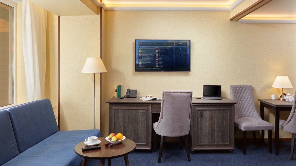 Двухкомнатный номер площадью 22 кв.м., двуспальная кровать, раскладывающийся 1,5-спальный диван. В номере два телевизора, чайная станция, фен, минибар. В ванной комнате туалетные принадлежности, полотенца, фен. Халаты и тапочки в номерах предоставляются для гостей от 12 лет.